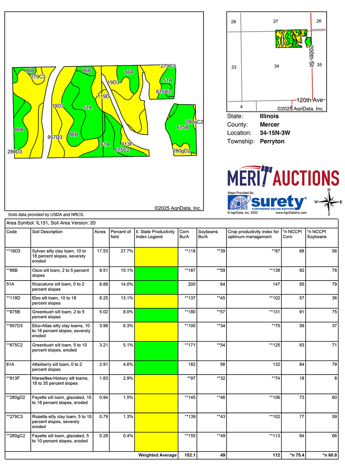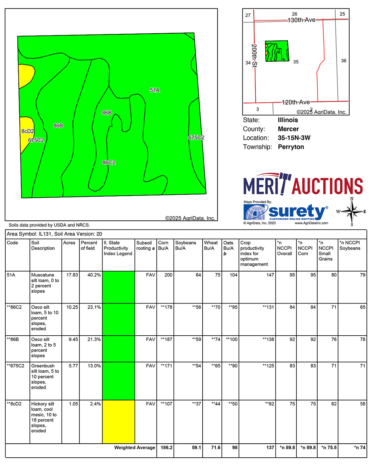 - Productive soil types include Sylvan, Osco, Muscatune, Elco, Greenbush, Elco-Atlas, Atterberry,Marseilles-Hickory, Fayette, Rozetta