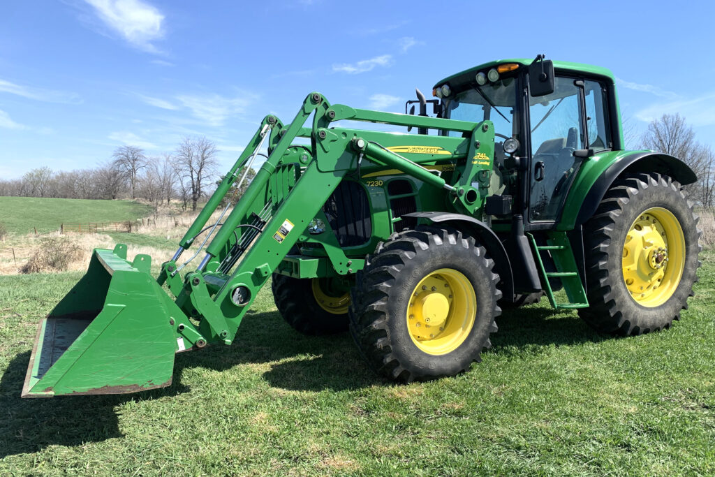 - 2007 John Deere 7230 Premium MFWD tractor, 16 spd. PowrQuad Plus trans., 3 hyd. outlets, 540/1000 PTO, full coverage rear fenders, front fenders, rear weights, 480/80R38 rear tires, 420/85R26 front tires, sells complete w/ John Deere 741 Self-Leveling loader, 96in. material bucket, ONLY 813 hours, SN RW7230H007878
