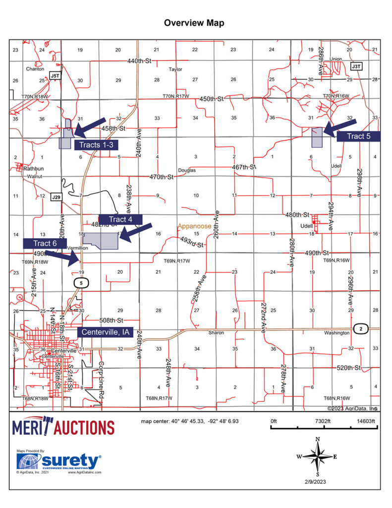 The Milani Estate farms are located in Sections 30, 31 & 32, Douglas Township, Section 1, Walnut Township, Sections 5, 6, 17 & 18, Vermillion Township and Sections 6 & 31 Udell Township, Appanoose County, Iowa. Tracts 1-3 are located 5 miles north of Centerville, Iowa in close proximity to Lake Rathbun. Tract 4 is located 2 miles north of Centerville, Iowa on St. Hwy. 5. Tract 5 is located 10 miles northeast of Centerville, Iowa, 2 miles west of the small town of Unionville, Iowa and in close proximity to Sundown Lake. Tract 6 is located 1.5 miles north of Centerville, Iowa on State Hwy. 5.