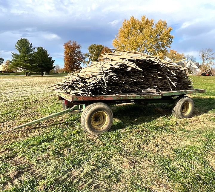 - Hay Rack on John Deere Running Gear, includes wooden stakes used for tobacco, 14ft x 7ft., 11L-15 tires