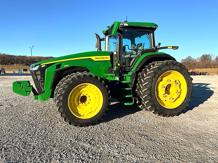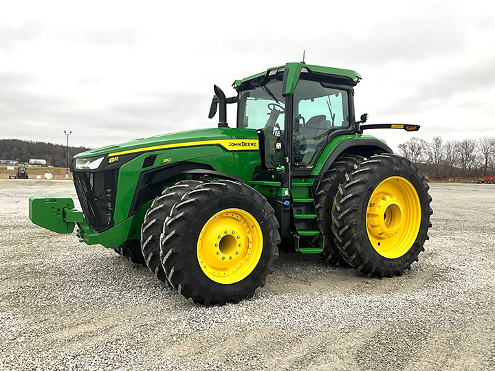 - 2022 John Deere 8R 410 MFWD Tractor, 1,800 hours, cab w/ heat & A/C, deluxe leather seat, 3pt quick hitch, big 1000 PTO, 6 hydraulic remotes, 22 front weights, 5 50kg rear wheel wheights, 1 small starter rear wheel weight, 480/80R50 rear duals, 420/85R34 front duals, SN: 1RW8410DCNB207310