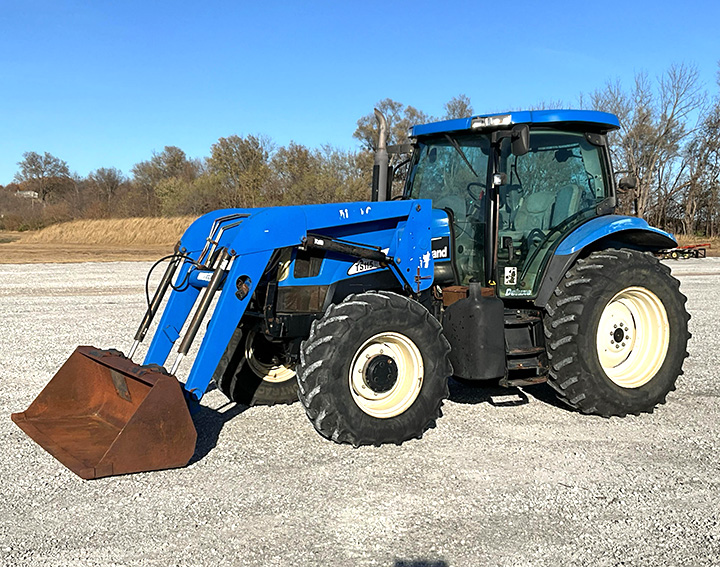 - 2005 New Holland TS115A Tractor. CAB w/AC, MFWD, 24×24 Dual Command Transmission, Two Rear Remotes, Telescopic Lift Arms, 540rpm PTO, Corner Exhaust, BushHog M646 Loader w/Bucket, 18.4-34 Rear Tires, 14.9R24 Front Tires. SN: ACP244389