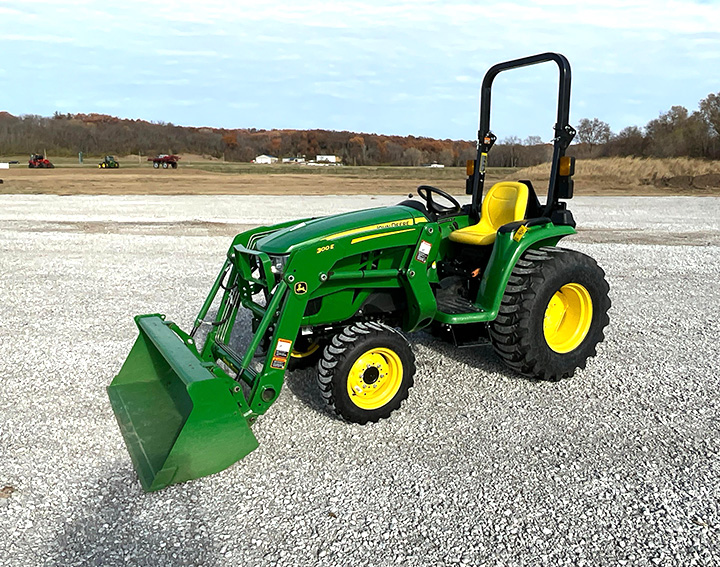 - 2022 John Deere 3038E MFWD compact diesel tractor, 121 hrs., open station, ROPS, hydro trans., 3pt hitch, 540 rear PTO,25X8.50-14 NHS front tires, 15-19.5 NHS rear tires, sells complete with John Deere 300E hyd. Loader, John Deere quick attach bucket, SN 1LV3038EJNN140617