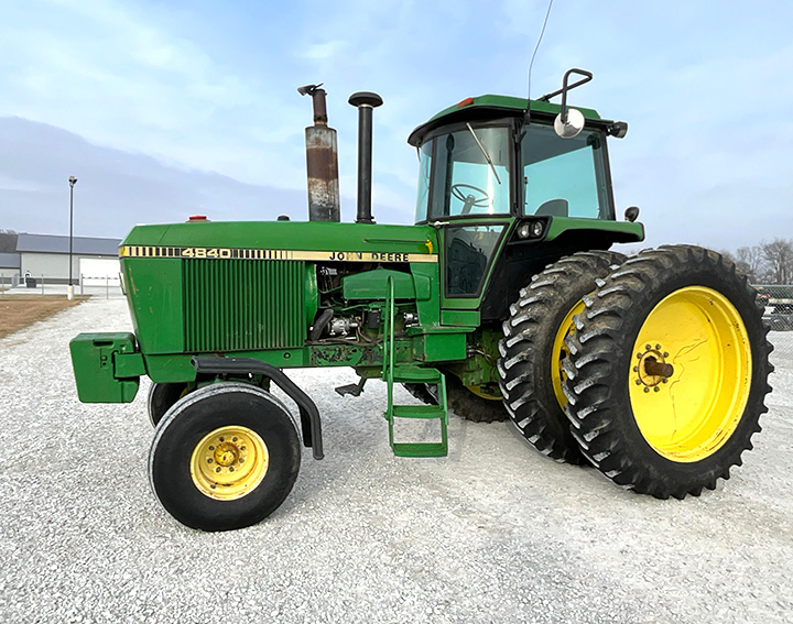 - John Deere 4840 Tractor, PS transmission, 2hyd. outlets, 1000 PTO, 10 front weights, 14-16.1 front tires, 14.9R46 rear duals, LED lights, showing 7,446 hours, SN: 005477R