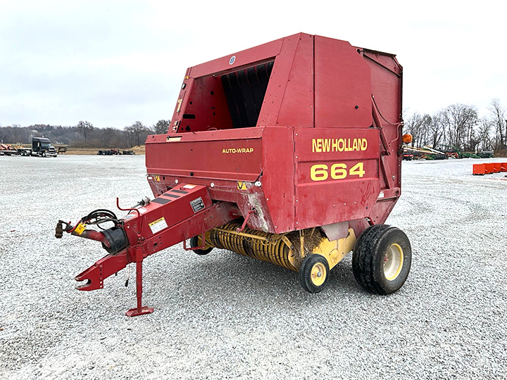 - New Holland 664 Big Round Baler, Auto Wrap, Twine Tie, 540 PTO, Monitor, 31×13.5-15 Tires, SN: 941810