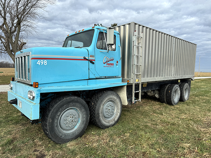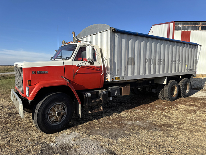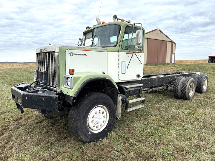 - 1985 GMC Brigadier tandem axel grain truck, 212,760 miles, 3421 hrs., Cat 3208 diesel engine, Eaton-Fuller Road Ranger 13sp. transmission, air brakes, 315/80R-22.5 front tires, 10.00-20 rear tires, 3-way cargo gate, roll tarp, VIN 1GDT8C4YIFV612755
