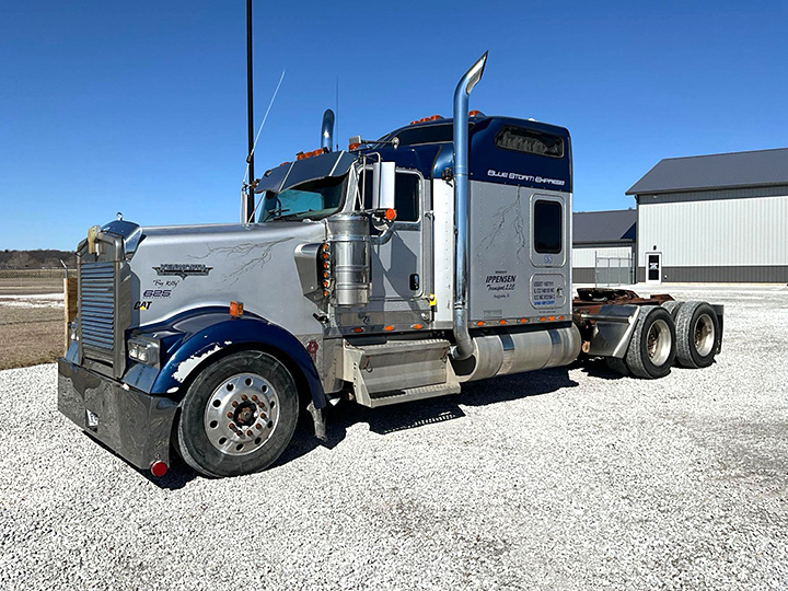 - 2000 Freightliner FLD tandem axle day-cab semi, miles showing: 624,904, Cummins ISM engine, Eaton-Fuller 10sp. transmission, 285/75R24.5 front tires on aluminum rims, 11R22.5 rear tires on steel rims, air ride suspension, air ride driver’s seat, dual aluminum fuel tanks, VIN 1FUY3MEB5YLG01695