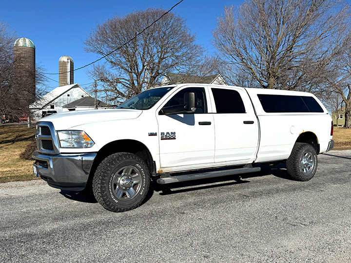 - 2014 Dodge Ram 2500 Heavy Duty 4X4 crew cab pickup, 196,615 miles, 5.7L Hemi V8 gas engine, automatic transmission, 8ft bed, ARE fiberglass topper, LT275/70R18 tires, chrome rims, pw/pl/cc, cloth interior, VIN 3C6TR5HT5EG185557