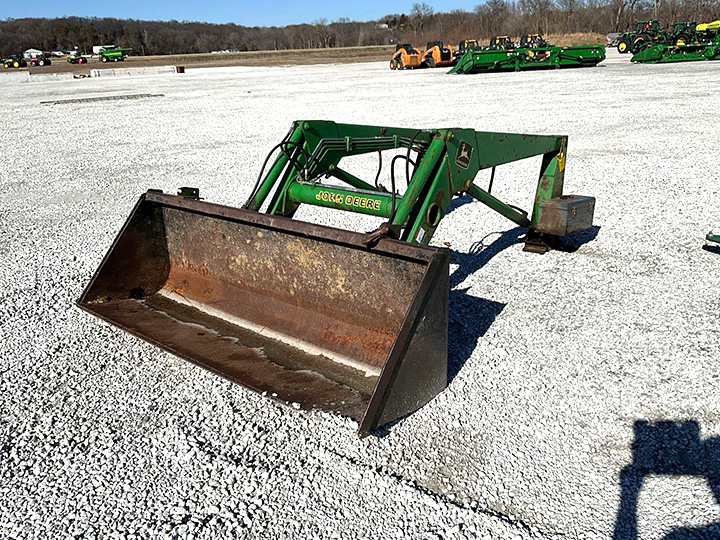 - John Deere 720 quick attach loader, joystick control, side mount valve body, mounting brackets, 84in. quick attach material bucket, quick attach bale spear, SN W00720C003584, Location: Ft. Madison, IA.