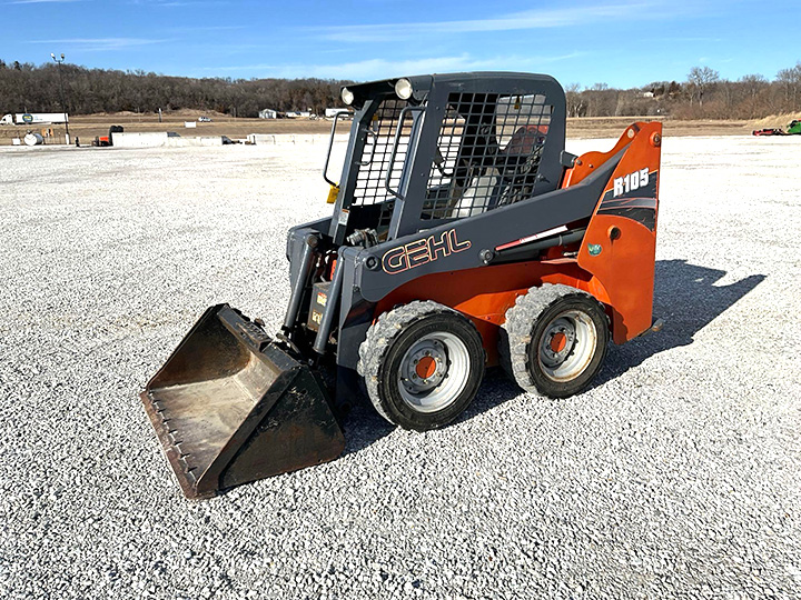 - 2017 Gehl R105 Skid Steer, Hours: 1,080. T-Bar Controls, Yanmar Diesel Engine, Aux Hydraulics, Lights, 52in. Bucket, 27×10.5-15 Tires, SN: GHL0R105COD181042, Location: Ft Madison, IA