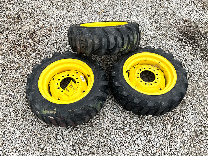 - (3) 17.5-25 industrial tires on Deere 14-lug grader rims – factory slave tires