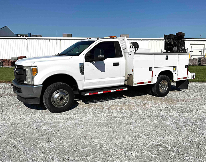 - 2017 Ford F350 XL reg. cab 4X4 Service Truck, 6.2L gas Engine, Automatic Transmission, LT245/75R17 tires, Dual Rear Wheels, Knapheide 11ft. Service Body, Hose Reel System, Compressor with Honda Engine, Tool Chest, 192,435 Miles, VIN: 1FDRF3H66HEB97900