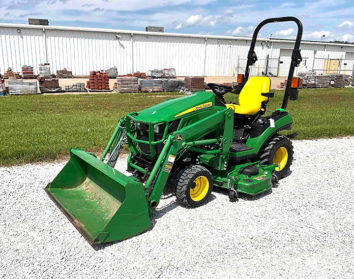 - 2016 John Deere 1025R MFWD Tractor, Hours: 673, Loader with 54in. Bucket, 60in. AutoConnect Mower Deck, hydro trans., ROPS, 3 Point, 540 PTO, 26×12.00-12 Rear Tires, 18×8.50-10 Front Tires, SN: 1LV1025RVGG101299