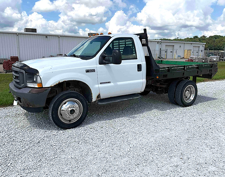 - 2003 Ford F-550 XL reg cab 4X4 Flatbed Truck, 6.0L Diesel Engine, Automatic Transmission, 9ft. Steel Flatbed with Gooseneck Ball and Receiver Hitch, Bench Seat, dual rear wheels, 225/70R19.5 Tires, Odometer Shows 106,835 Miles, VIN: 1FDAF56P83EB92064