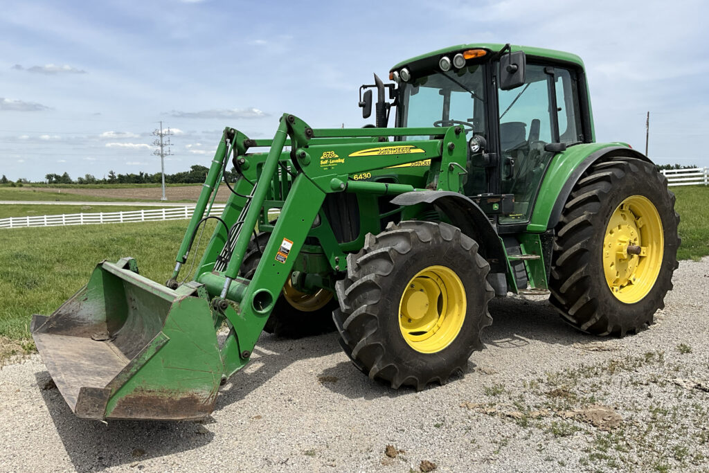 - 2010 John Deere 6430 Premium MFWD Tractor, sells w/ John Deere 673 self-leveling loader, 20 speed PowerQuad trans., w/ LH reverser, 2 hyd. outlets, 540/1000 PTO, 3pt. with top link, 84in. bucket, 420/85R24 front tires, 460/85R38 rear tires, 4,798 hours, SN L06430K648139